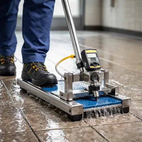 A tile might feel like sandpaper when it’s dry, but the moment a cleaning crew mops it or a rogue humidity spike hits it, it can turn into a skating rink. Testing evaluates the dynamic coefficient of friction. It mimics a human heel strike to see if the surface actually grips.